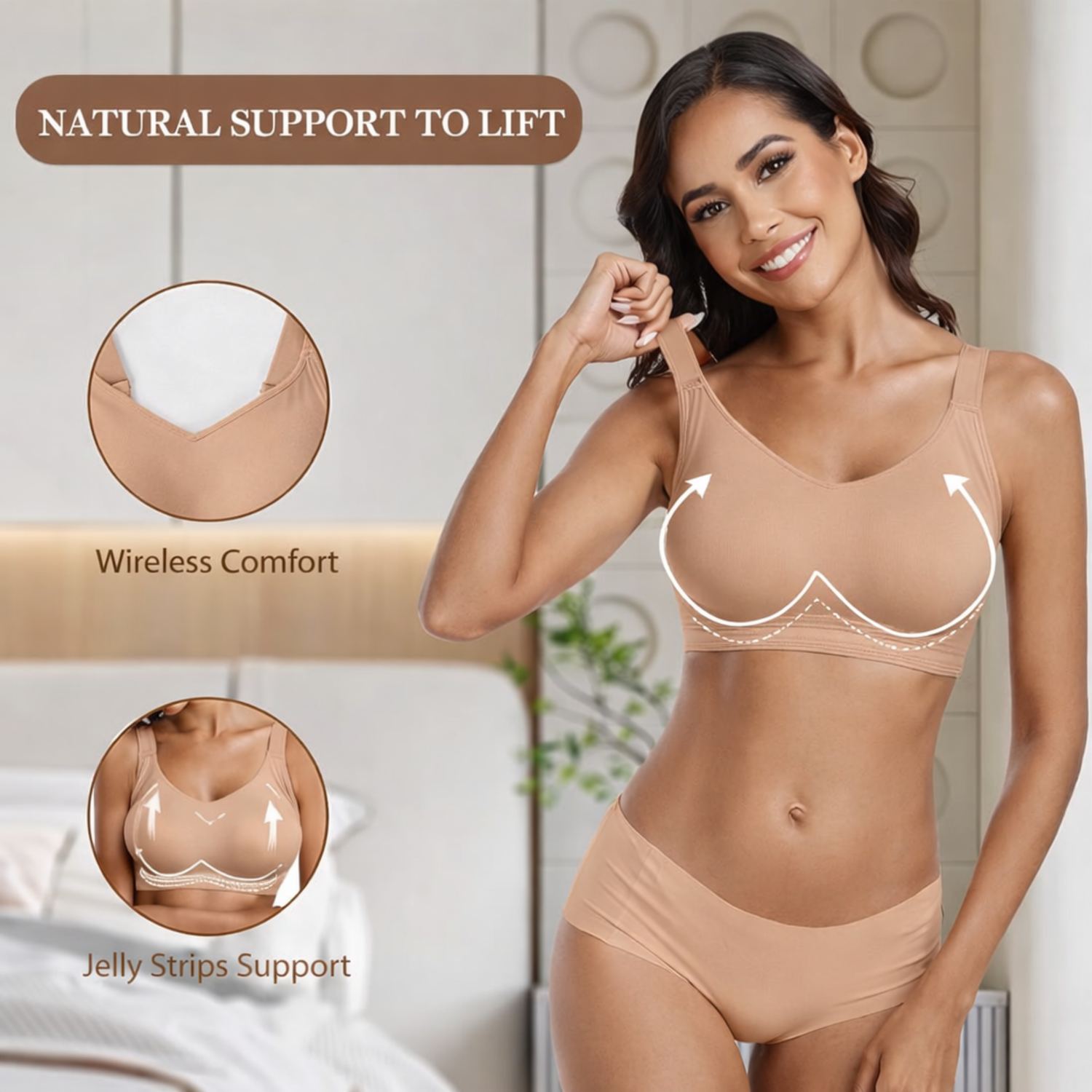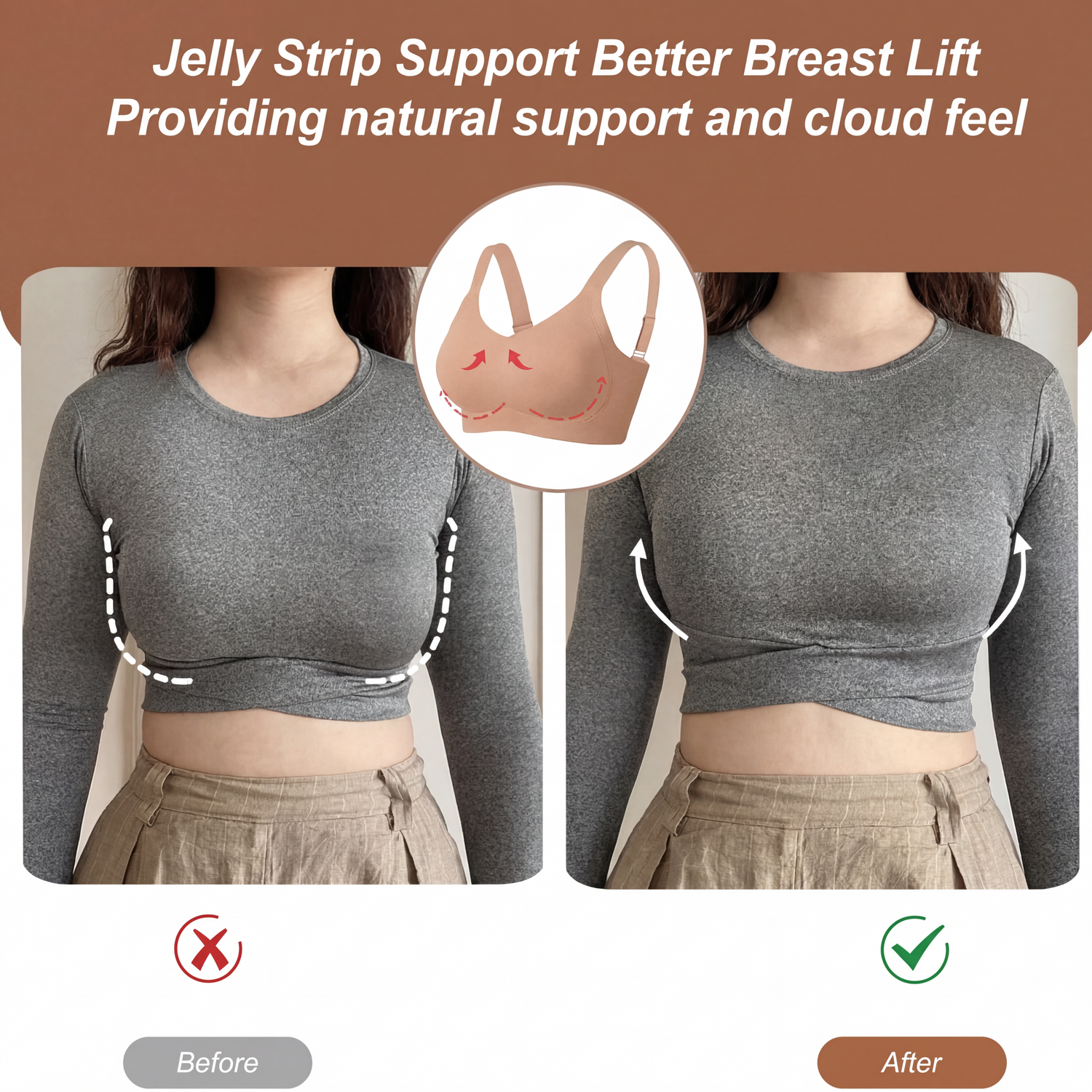 Built with an innovative jelly strip support system, this bra gently lifts and shapes the bust from underneath, creating a natural push-up effect without wires. It provides cloud-like comfort while enhancing breast contour for a smoother, more confident look under any outfit.
